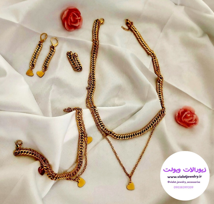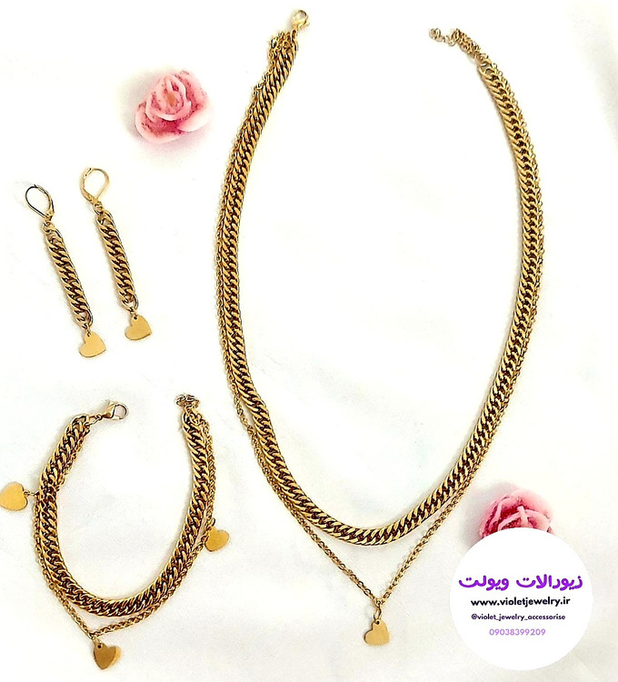 ست کارتیر دوبل شامل گردنبند دولاین با آویز قلبی دستبند دولاین آویزدار و گوشواره میباشد جنس تمام استیل و رنگ ثابت