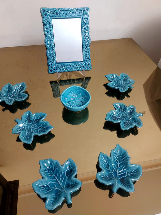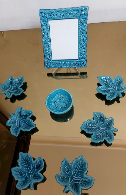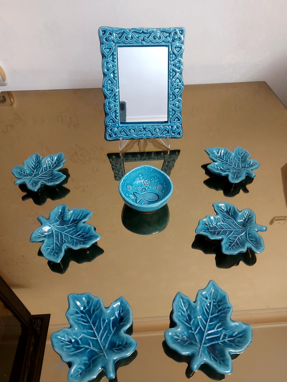 هفت سین سفالی فیروزه ای شامل ۶ عدد ظرف بشکل برگ یک کاسه سفالی با طرح ماهی و یک آیینه میباشد