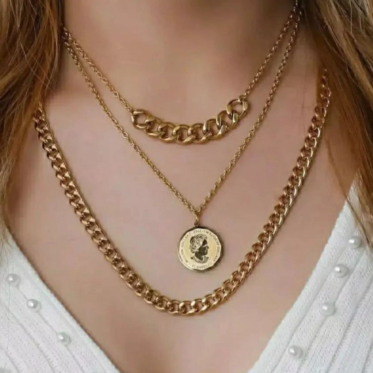 گردنبند استیل طلایی سه لاین با اویز الیزابت با کیفیت فوق العاده و قیمت بسیار اقتصادی برای شما دوست داران زیورالات