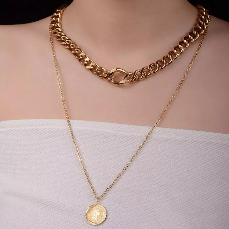 گردنبند استیل طلایی که تلفیقی از کارتیر بزرگ و زنجیر ظریف استیل است همچنین با اویز الیزابت استیل جذابیت زیادی را برای خود ساخته