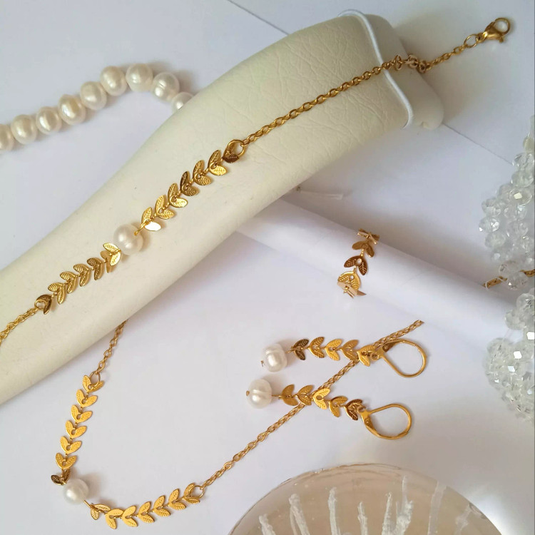 ست گردنبند.دستبند.گوشواره. انگشتر استیل رنگ ثابت به همراه مروارید پرورشی زیبا جنس عالی