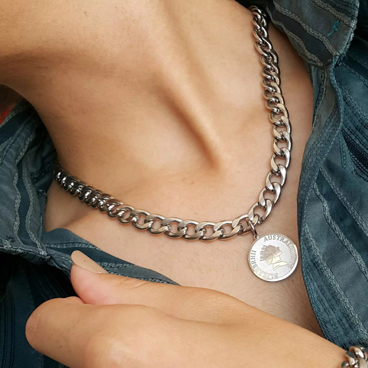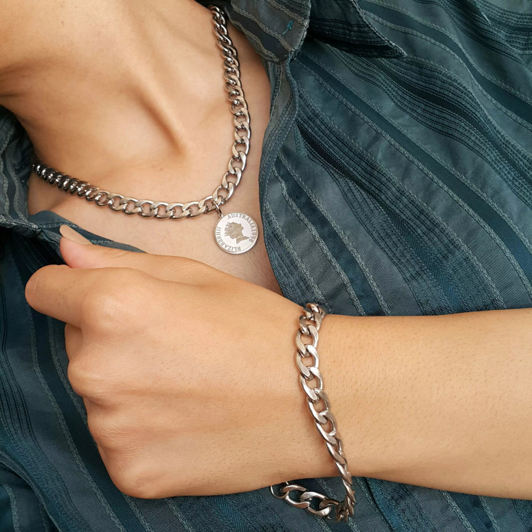 گردنبند دستبند کارتیر نقره ای استیل رنگ ثابت با آویز سکه الیزابت که مدلی اسپرت هستش مناسب مردونه و دخترونه