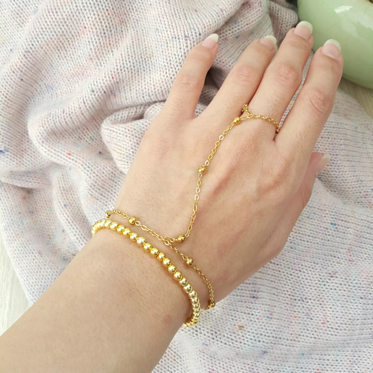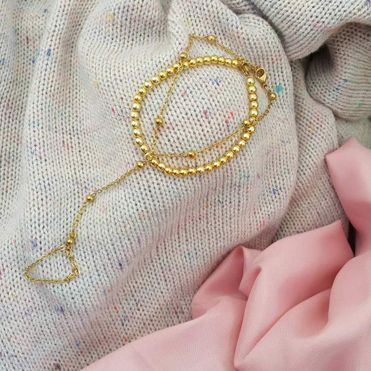 تمیمه دست با زنجیر توپی استیل رنگ ثابت و حدید توپی رنگ ثابت و دستبند دو ردیفه که اجزای کار کلا رنگ ثابت