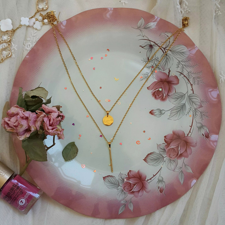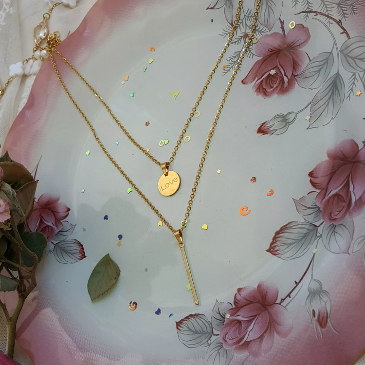 گردنبند دو ردیفه دایره با حکاکی لاو و استوانه ساده طلایی رنگ ثابت کد ۱۲۴۳