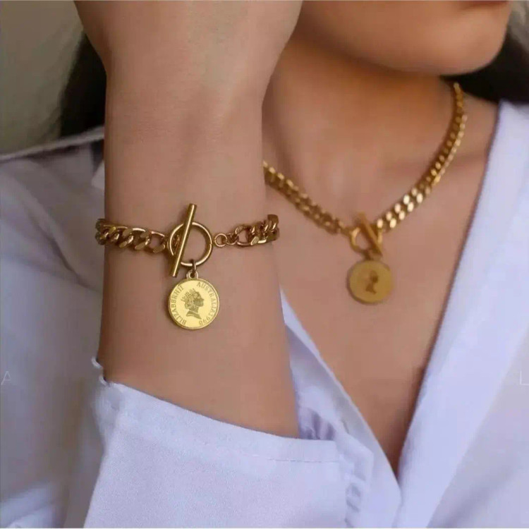ست گردنبند و دستبند کارتیر با آویز سکه الیزابت ترند ترین کار این روزا😍 جنس کار تمام استیل و رنگ ثابت کار دستساز امکان تغییر مدل طبق سلیقه مشتری اندازه و سایز طبق نظر مشتری امکان سفارش ب صورت تک و یا ست ضمنا امکان ست با انگشتر و گوشواره نیز وجود دارد