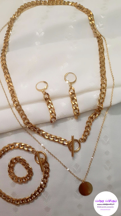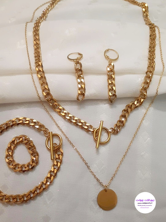 ست گردنبند دستبند انگشتر گوشواره کارتیر زنانه با آویز سکه و قفل تی جنس استیل (ویولت گالری کد ۱۹۳۹)