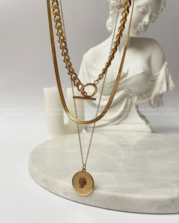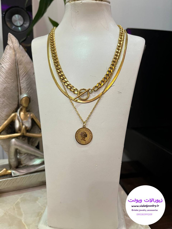 گردنبند سه لاین کارتیر و زنجیر ماری و آویز الیزابت جنس استیل طلایی رنگ ثابت کد ۱۲۷۶