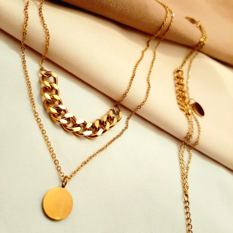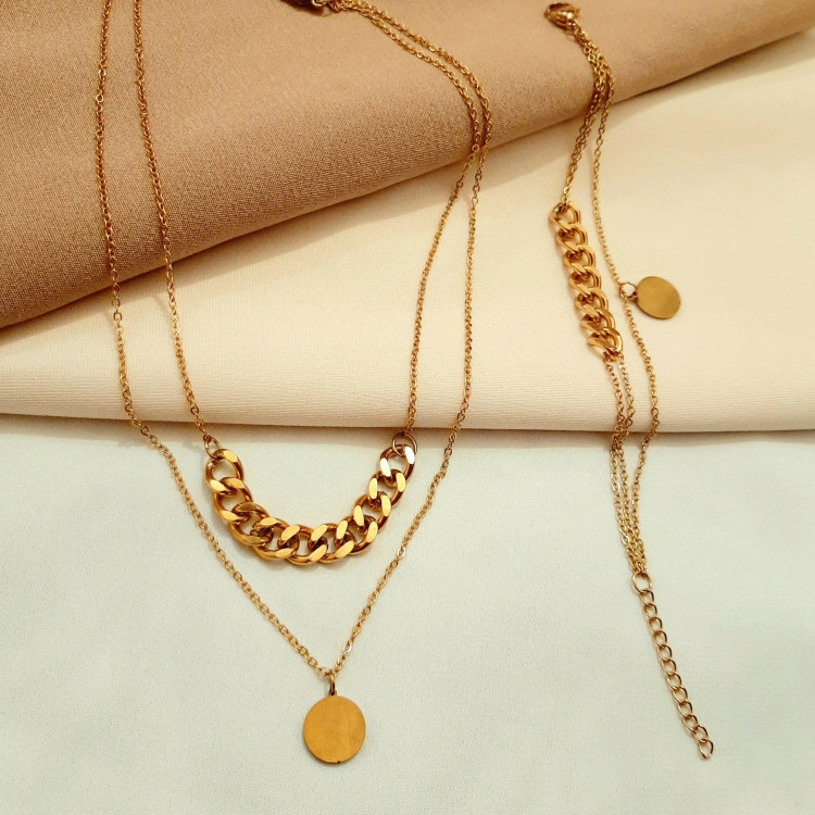 ست گردنبند دستبند زنانه دو لاین ترکیب زنجیر کارتیر و آویز سکه جنس استیل (ویولت گالری) کد ۱۹۴۷