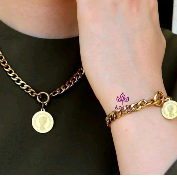 نیمست گردنبند دستبند کارتیر تخت با آویز الیزابت و قفل ملوانی طلایی جنس استیل رنگ ثابت (ویولت گالری) کد ۱۹۴۹