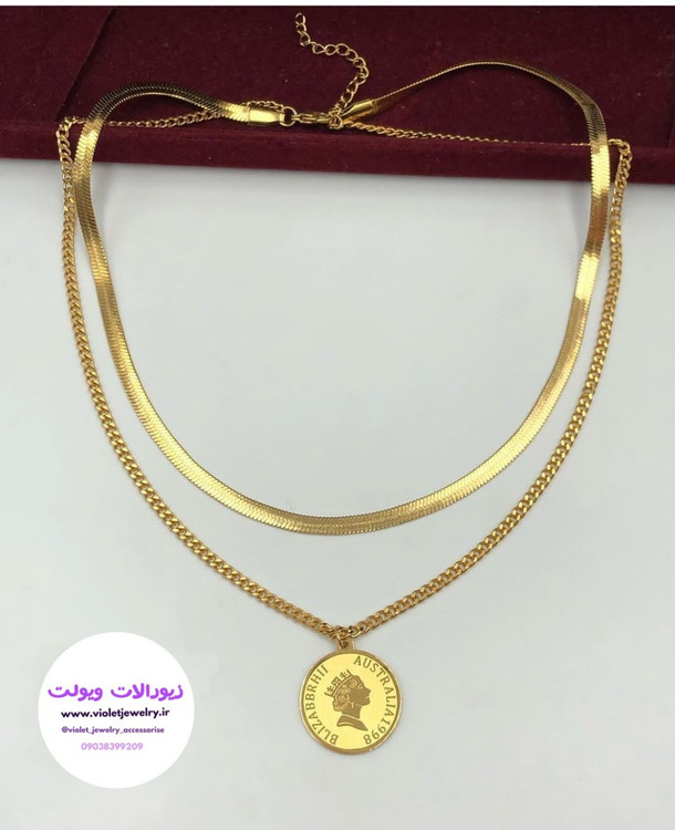 گردنبند ۲لاین کارتیر و زنجیر ماری جنس استیل رنگ ثابت به طول ۵۰ و ۵۵ سانتیمتر با آویز سکه الیزابت