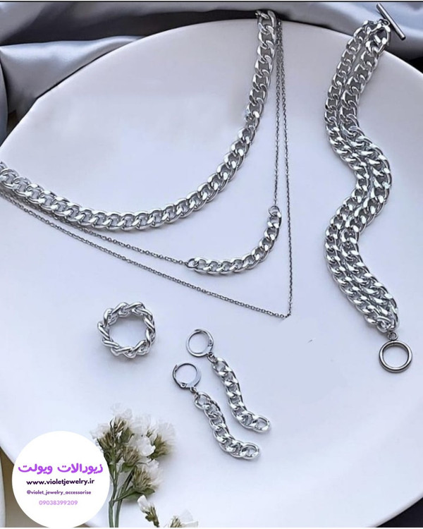 ست کارتیر زنانه جنس استیل شامل گردنبند ،دستبند به طول ۱۹ سانتیمتر انگشتر به سایز دلخواه مشتری،و گوشواره آویزی میباشد.