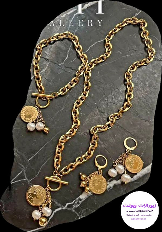 ✨️ست زنانه طلایی جنس استیل با آویز سکه و مروارید بصورت ترکیبی الهام گرفته شده از ژورنال های برند طلا و جواهرات ساخته و پرداخته شده است✨️
