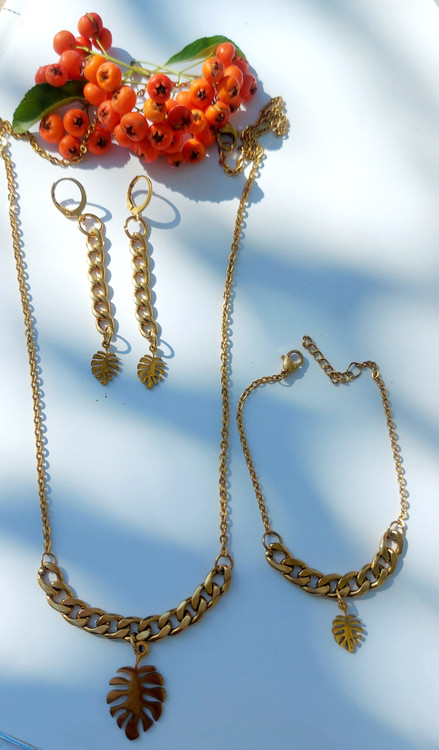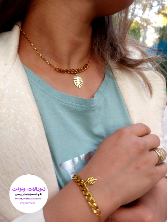 ست کارتیر و برگ انجیری شامل گردنبند، دستبند، و گوشواره آویزی طلایی جنس استیل با کیفیتی عالی میباشد
