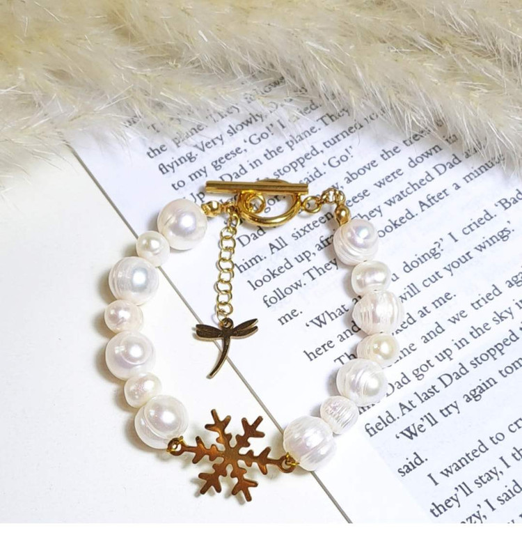متاسفانه این کالا در حال حاضر موجود نیست. میتوانید از طریق لیست بالای صفحه، از محصولات مشابه این کالا دیدن نمایید.دستبند مرواریدی زنانه از بهترین جنس مروارید پرورشی با شکل نامنظم و رنگ ثابت با پلاک استیل طرح برف و قفل استیل مدل T